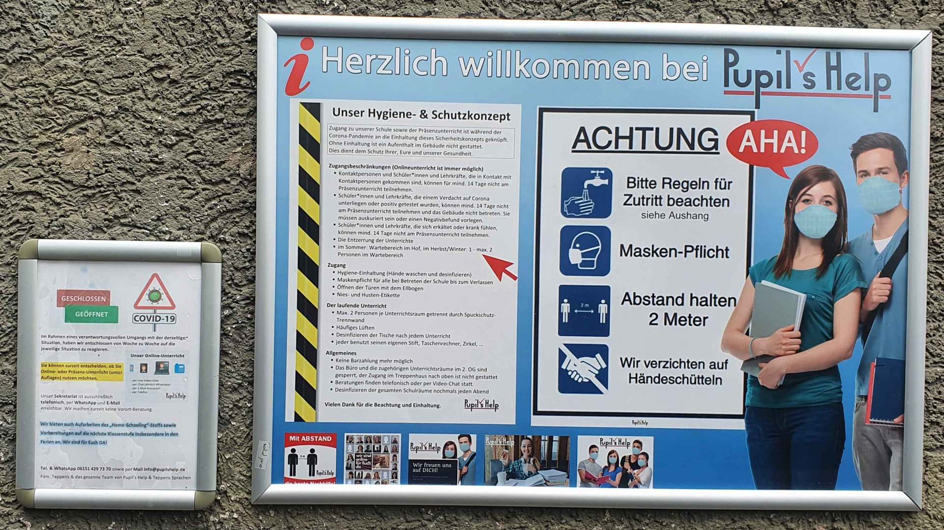 Wir haben in alle Unterrichtsräume große Spuckschutze installiert, Desinfektions-Spender montiert, Aufsätze für Türdrücker angebracht, Hinweisschilder aufgehängt und ein Konzept entwickelt.